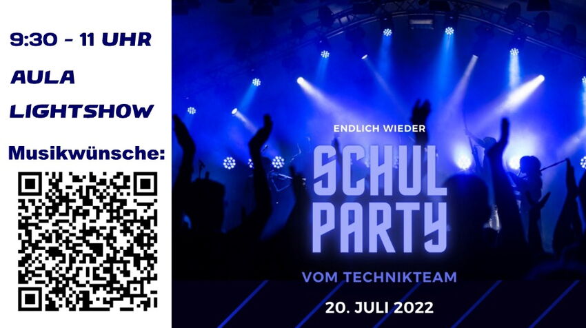 Am Mittwoch, den 27.07. ab 9:30 Uhr geht´s rund bei uns in der Aula: Endlich findet wieder die Sommerparty des TechnikTeams statt … und alle sind schon voller Vorfreude. Tanzen, Hüpfen, lustige Spiele und eine coole Lightshow stehen auf dem Stundenplan – statt Mathe, Deutsch oder Englisch. Damit auch für alle die richtige Musik gespielt wird, kann in der eigens geschaffenen Umfrage teilgenommen werden. Das wird bestimmt eine tolle Sache! Wir freuen uns schon!