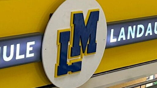 Beleuchteter Schriftzug „Mittelschule Landau“ bei Treppe/Aula